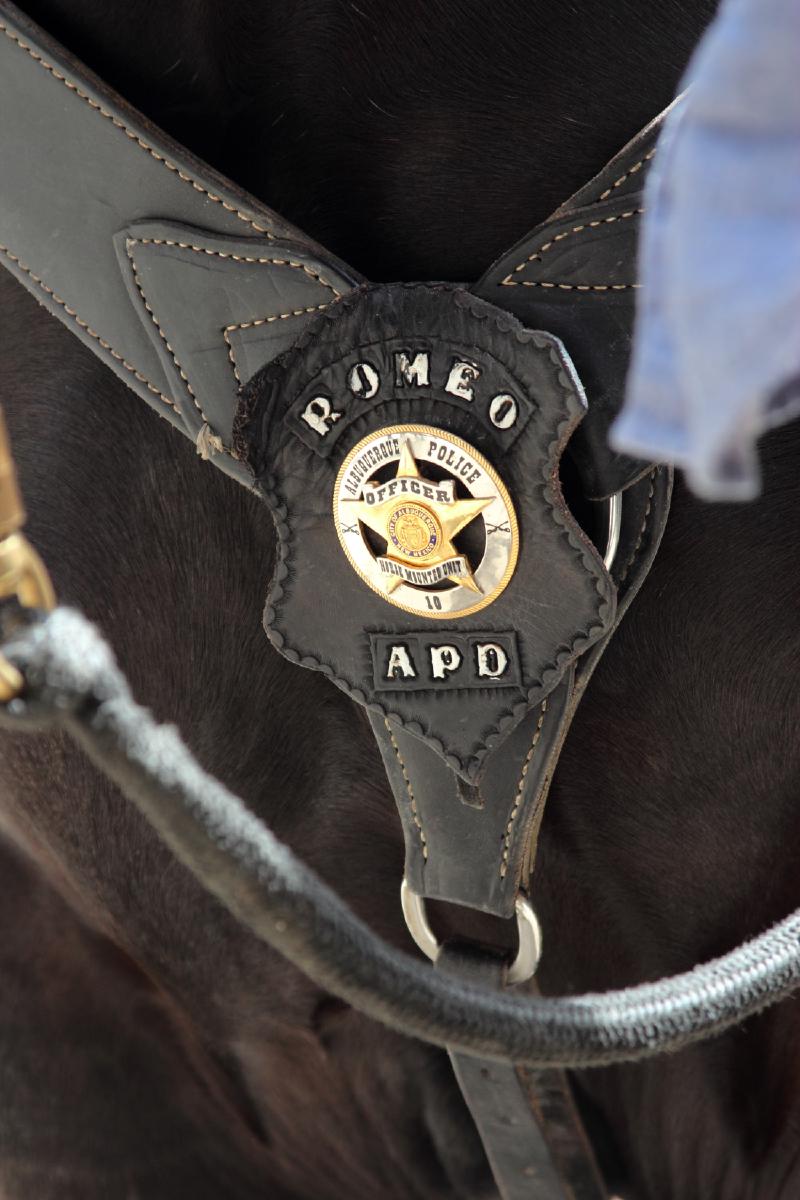 The APD Horse Unit has been in operation since 1977. The two gentlemen pictured are the only two full-time mounted police officers, with over seven horses stabled in the North Valley. They ride a different horse each day. The horses, Max and Jake are both draught horses.