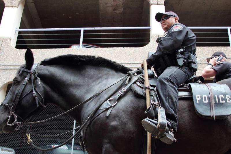 These types of horses are unusual to see as riding horses. They are bred to be working animals, more often seen pulling carts or plowing fields. The officer told me that the bone density of the type was well suited to road work, their temperament is calm, and there is a psychological advantage during crowd control using such massive beasts. I agree, you don’t want to get stepped on by either of these horses. Their feet too have special shoes, including a strip of leather between hoof and metal, that helps as a shock absorber on unforgiving tarmac. Both officers were happy with their detail, and were so friendly and professional that I felt proud to see such progressive (if old-fashioned) community policing.